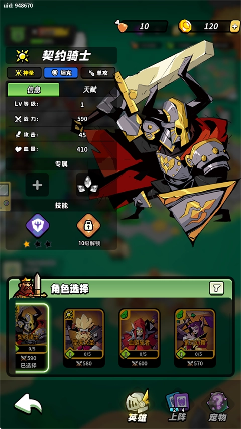 契约骑士属于T0级别,兼具扛伤与输出能力,30级时可解锁眩晕技能。(新手玩家能免费获取10级的契约骑士,具体情况会在后续的资源篇中说明。)