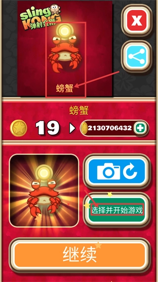 获取【螃蟹】角色后,点击【选择并开始游戏】按钮,就能用这个角色开启新一轮的弹射关卡。