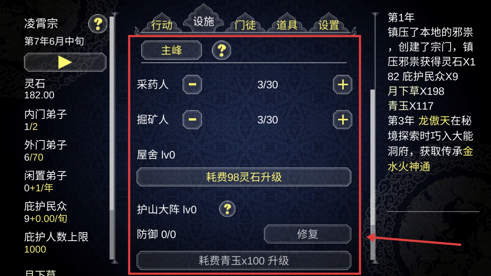 提升【屋舍】与【护山大阵】的等级,通过消耗【灵石】和【青玉】来强化宗门根基,科学调配资源能够进一步提升宗门的发展潜力。