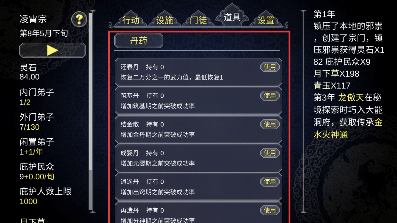 根据弟子的境界来使用【筑基丹】到【结金散】这些丹药,能够提升他们突破境界的成功率;另外,还春丹可以恢复武力值,需要根据实际需求进行储备。