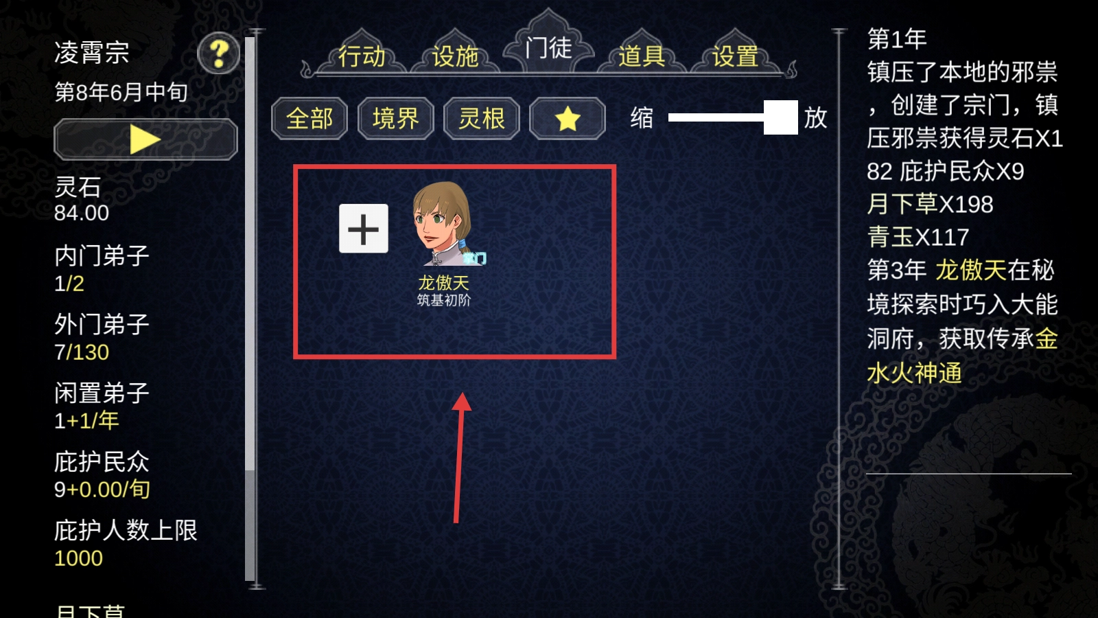 招募【龙傲天】这类筑基初阶弟子,以增强宗门战力,可通过点击加号按钮补充弟子,优化人员配置。