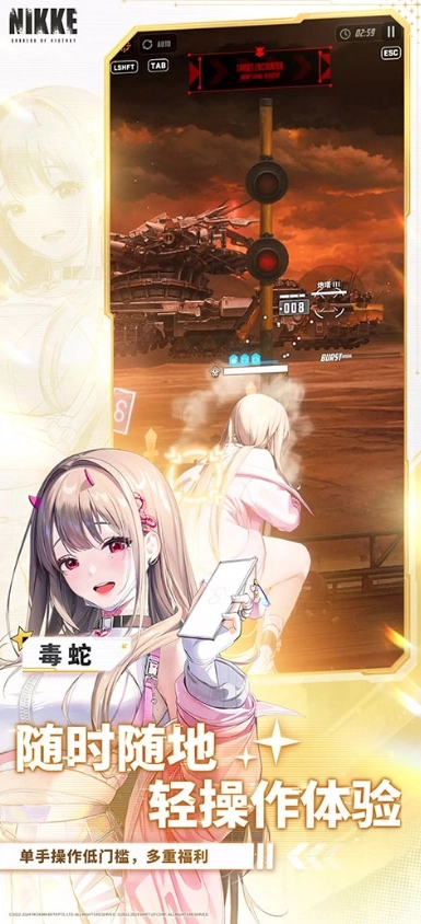 胜利女神:NIKKE 是一款移动平台的第三人称射击角色扮演游戏,其核心亮点在于精致的视觉呈现、便捷的单手操控设计,以及围绕人类被迫转入地下后的未来主义叙事展开。当全人类的存亡与新的希望交织之际,唯有你与你在这场全新冒险中的抉择至关重要——在这个亟待探索的世界里,射击玩法与卡牌收集元素将巧妙融合。