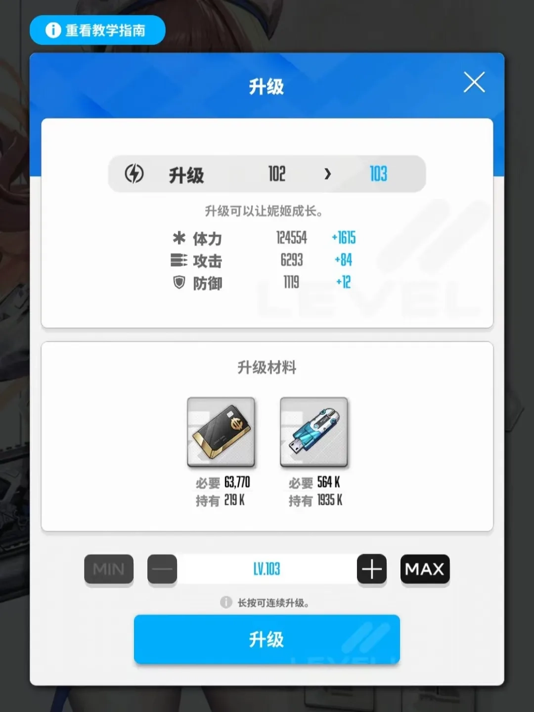 升级妮姬需要用到信用点(也就是钱)、战斗编辑器(作为经验道具)以及芯尘(成长类道具)。