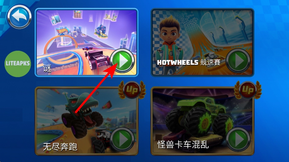 在游戏初始展示界面,点击左侧带有循环图标的按钮,触发界面跳转后进入游戏玩法模式选择页面,为游戏内容做准备。