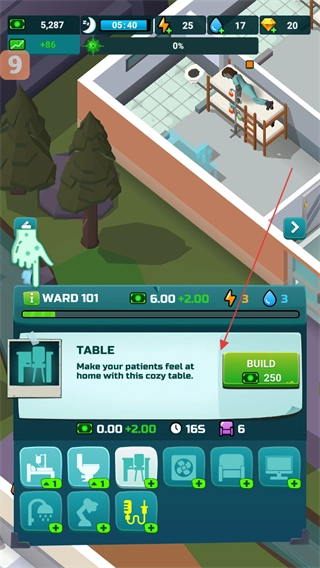 进入WARD101区域后,找到TABLE对应的BUILD按钮并点击,消耗250资源来建造桌子。