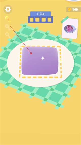 2、第一步,你需要滑动屏幕,让冰淇淋在桌边上摊开并铺平,只要它能完整覆盖住黄色的边框线,就可以进入到下一步操作了。