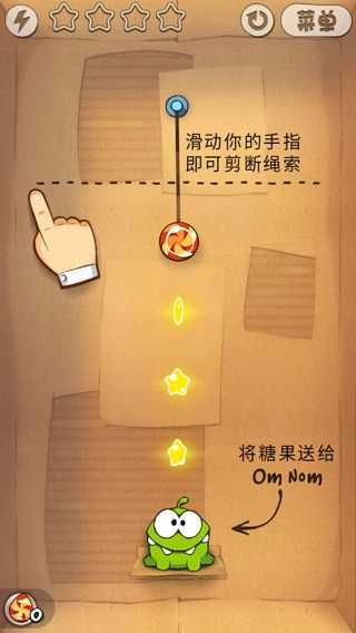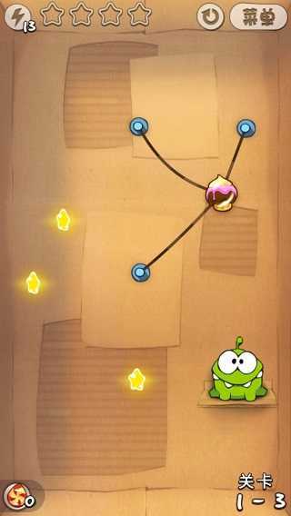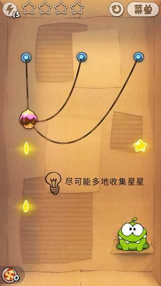 第三关延续了摆动的核心机制,关键在于精准把控角度。推荐先切断右侧的绳索,等糖果摆动到最高点并碰到上方的星星时,立刻切断顶部的连接绳,这样就能顺势拿到第二颗星;之后的路线会自然呈现,第三颗星也能轻松获取。