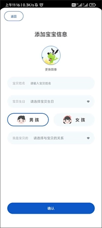 在这个界面,我们只需填写好宝宝的相关信息,接着上传一张宝宝的可爱照片,等所有内容都填写完毕后,点击确认按钮即可。