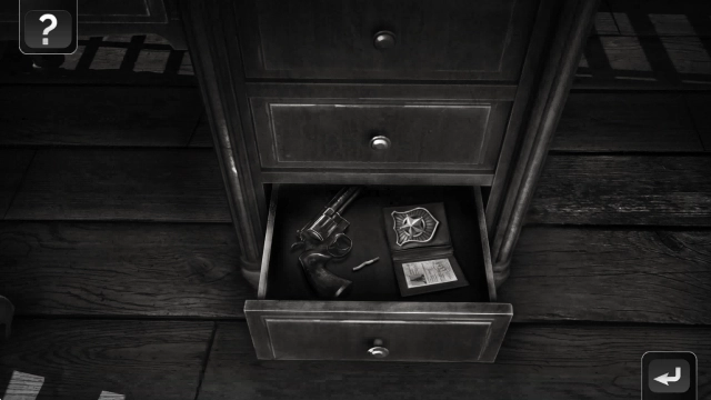 1、点击桌子右侧最下方的抽屉,就能拿到警徽、一根烟和左轮手枪。