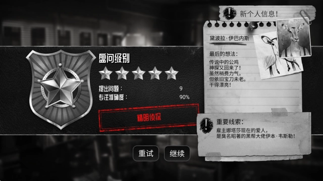 3、带来如电影般的黑色电影沉浸体验,包含二十余个过场动画,借助复杂的审问机制,可探寻丰富的线索、信息与各类收藏品。