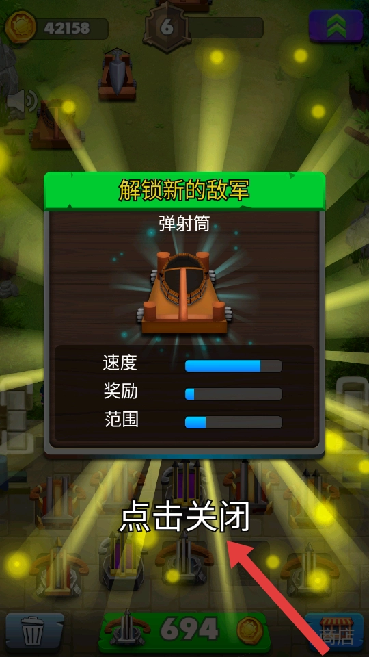 完成一轮战斗后,会解锁新的敌军单位(例如弹射筒),此时点击关闭提示即可继续游戏,同时需要调整防御策略来应对这些新敌人。