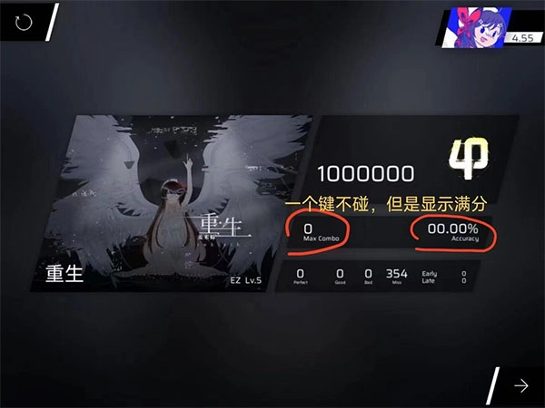 2、打开歌曲《重生》,接着等待它自然播放结束(期间不要触碰任何按键),就能看到一个显示为1,000,000的虚假数值(具体画面见下图)。