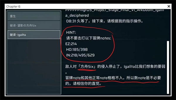 3、接着游玩与重生难度相同的“望影の方舟Six”(此时该关卡的铺面会出现假note,也就是下落速度较慢、和整体铺面风格格格不入的note),注意不要击打这些假note(其中EZ难度仅有1个,具体样式可参考下图;HD难度有2个;IN难度则有3个,相关演示可见下方附带的视频),并且要达到A及以上的评级。当退出结算页面时,就会自动跳转至Igallta的解锁动画。
