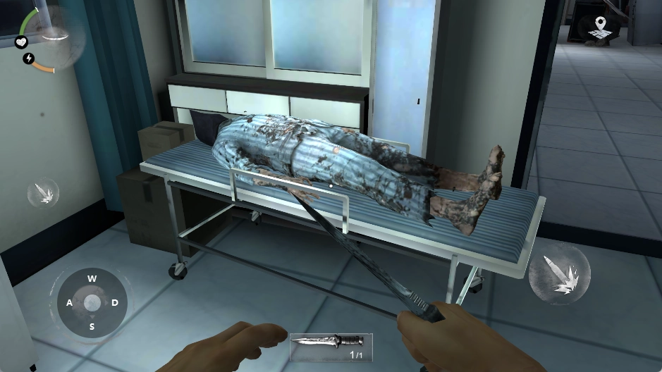 5、进入走廊后,走在前面,蹲下。这里有丧尸。用背后的匕首杀死他。当丧尸死后,他会传送一把钥匙来开门。靠近时,门上会有语言提示。用刚才使用的钥匙打开。