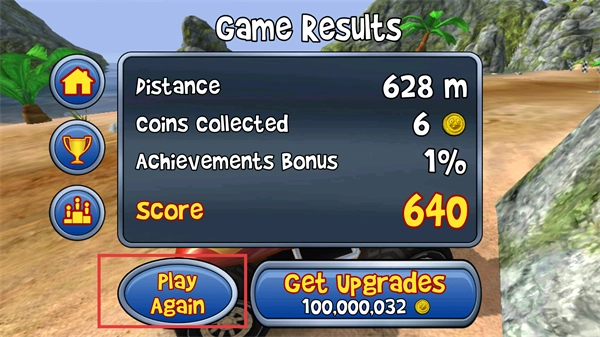 4、结算界面查看【Distance】【Coinscollected】数据,点击【PlayAgain】重启挑战,积累资源解锁升级。