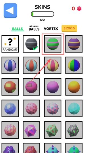2.个性化外观设置:进入“SKINS”界面后,通过左右滑动来浏览皮肤列表,从51款不同风格的皮肤里挑选出你喜欢的那一款,然后点击“BALLS”按钮即可完成使用确认。