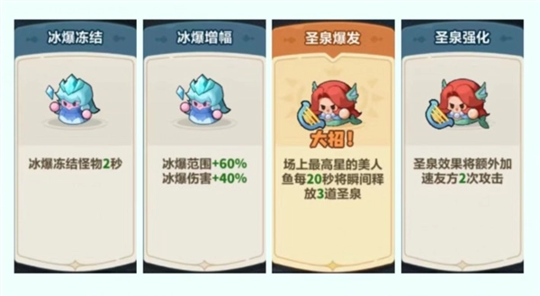 ① 上述4个强化词条,仅在未刷新出与河掌柜、剑圣相关的强化效果时,才会纳入选择考量,优先选取冰法师的【冰爆冻结】以及美人鱼的【圣泉爆发】这两个大招。