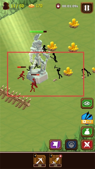 3、指挥【锤子】火柴人优先攻击敌方核心雕像,利用高爆发伤害快速削弱敌方战力缩短战斗时间。