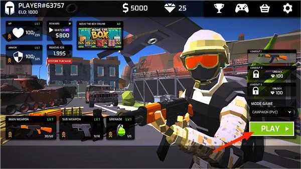 1、游戏左下角是可以选择的武器,有狙击枪和手枪以及手雷,点击play进入游戏