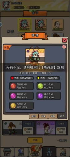 游戏里看不到弟子的总数量,随机数的感觉很明显,还设有品级系统,最多能上阵六名弟子。单个弟子的养成线包含等级提升、升星、装备搭配和丹药服用这几个方面,整体设定和卡牌类游戏的养成模式非常相似。