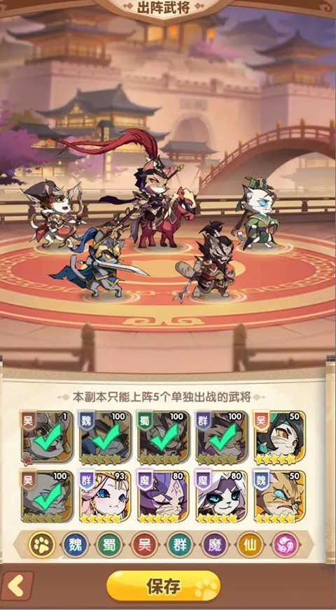 在单骑破阵玩法里,主公们能挑选1到5名武将参与战斗,一旦确认,这次就不能再更换出战的武将了。