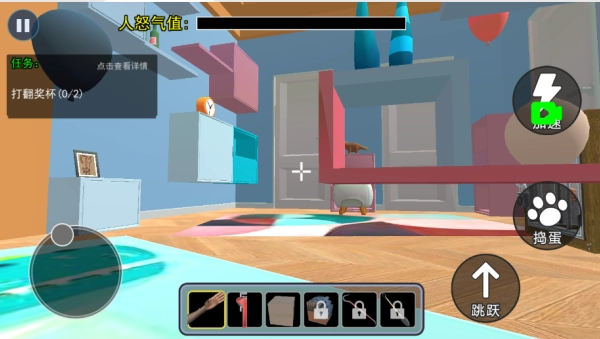 在接到打翻奖杯的任务后,首先要留意房间内奖杯所在的位置,接着借助左侧的虚拟摇杆来操控移动,等靠近奖杯后,再通过“捣蛋”功能或者物理碰撞的办法把奖杯打翻。