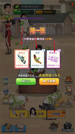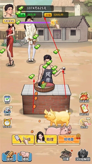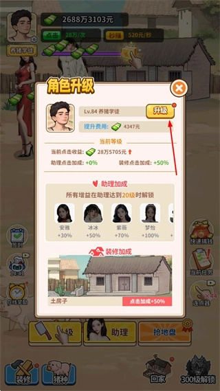 可以对角色进行升级,以此提升点击收益和等级,升级操作需要消耗金币,同时助理和装修也能带来收益加成。