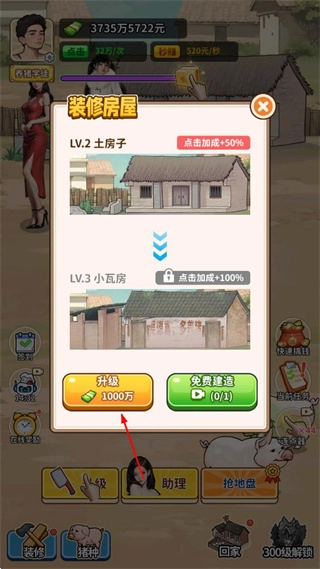 对房屋进行装修,以此提升房屋等级。升级时可以消耗金币,也能利用免费建造次数来完成,这样做能够提高点击收益的加成。