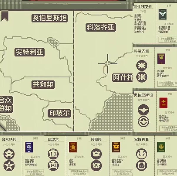 其中“阿什托兹卡”是我们的背景城市,其余均为外国入境城市。外国入境城市没有行政区,设有外交专用章,因此国家签证上会印有对应的LOGO图案,若不符合这一情况,即为伪造(比如大爷的签证)。
