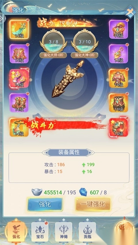 通过对武器进行强化、镶嵌宝石、神铸打造、属性洗练等操作,能够让你变得更加强大。