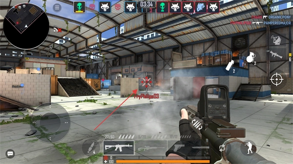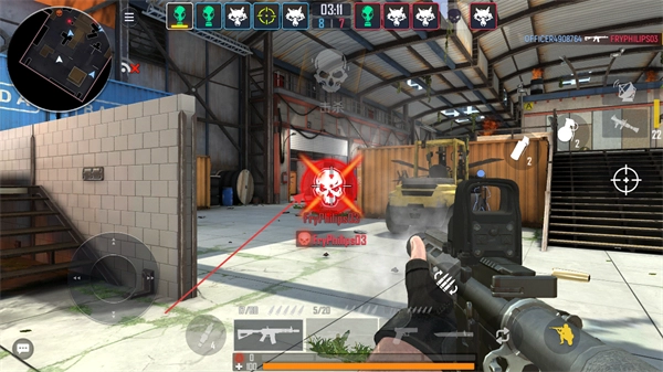 在仓库场景里,通过虚拟摇杆操控移动,锁定敌方角色并发动攻击。