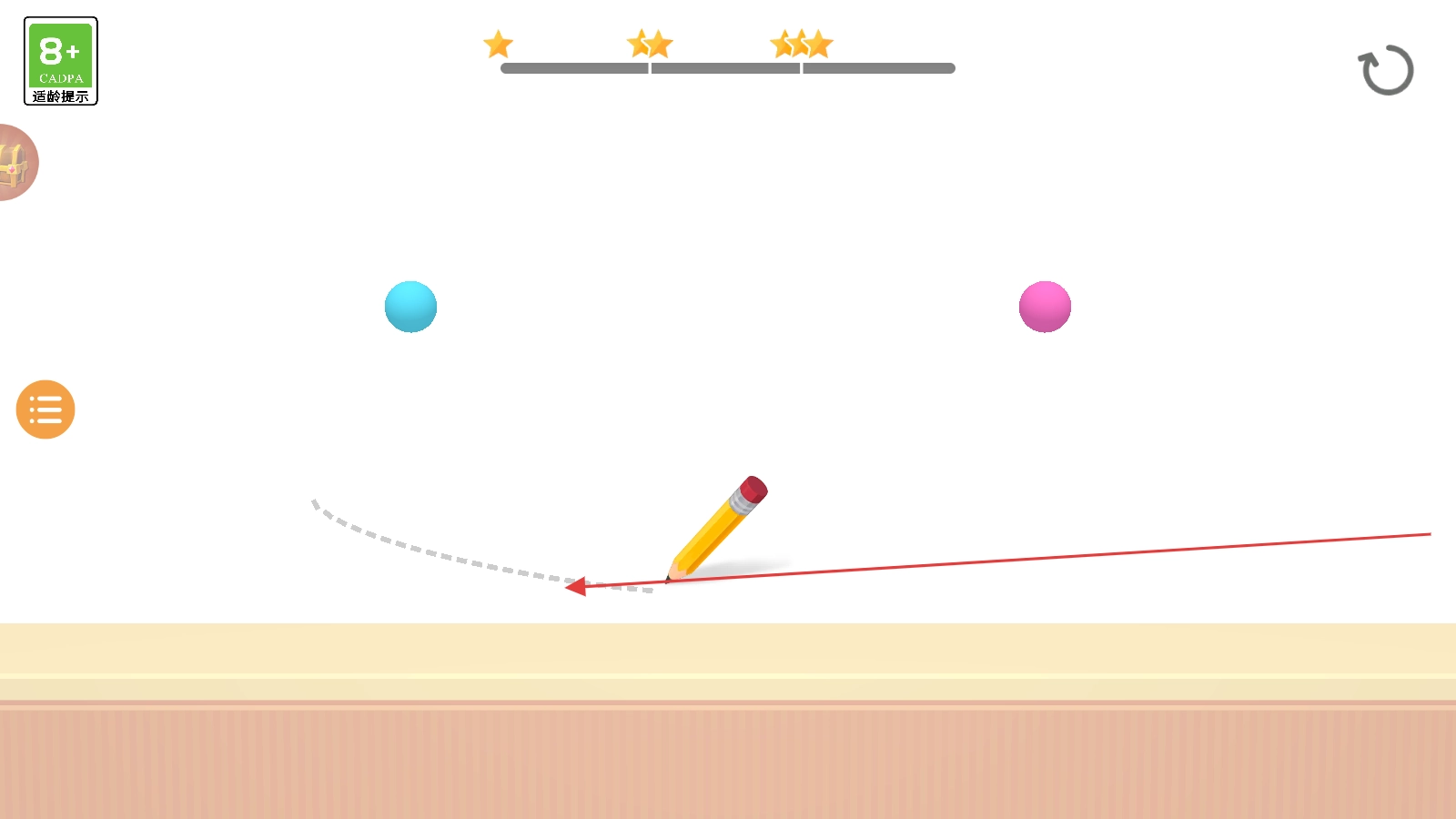在关卡中,按照指引用铅笔描绘线条,使小球移动并相互接触就能完成关卡。