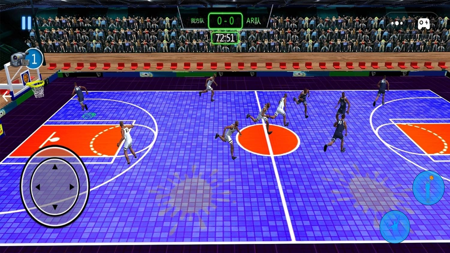 2、比赛过程中,玩家可借助虚拟按键来操控球员完成移动、传球、投篮等一系列动作,与对方球队展开激烈交锋,全力争取得分。