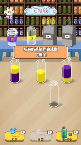 4、待所有容器都完成单一颜色的填充后,就达成了饮品制作的目标,能够顺利解锁后续的关卡挑战。