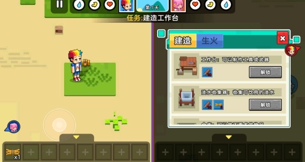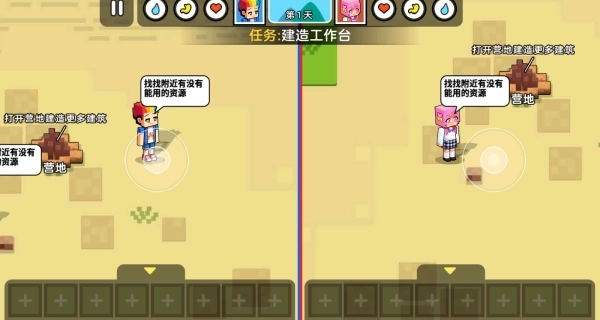 1.玩家要和队友分工配合,通过点击来收集散落在各处的基础资源,再借助合成台把这些资源制作成高级工具和建筑材料。