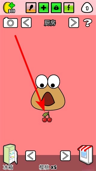 在厨房场景中,你可以从冰箱里或者去商店采购来获取食物,比如樱桃这类水果都可以。只需点击选中的食物喂给Pou,就能满足它的饮食需求,让它一直处于饱腹的状态。这可是维持Pou身体健康最基础的操作步骤呢。