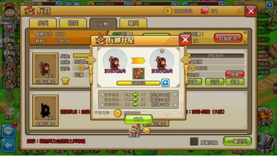 2、村长大人能够在兵营里给对应的兵种提升星级。兵种升星之后,其生命、攻击、力量这三项基础属性会得到显著增强。和武将相同,兵种的星级上限也是5星。