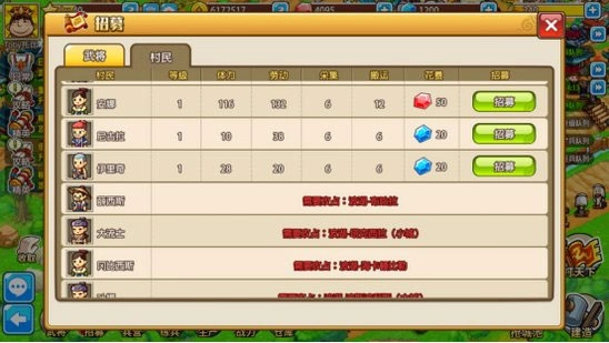 1、村长们可以在村庄界面下方点击【招募】→【武将】进入武将招募界面,每次进行招募操作都会额外获得金币奖励。