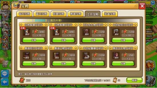 3、士兵升星需消耗金币、红玉牌或对应兵种碎片。多数情况下,玩家可通过红玉牌在三十五级解锁的士兵宝殿中兑换兵种碎片,直接点击界面上的蓝色小加号即可跳转至兑换页面,这个设计是不是很贴心呢~