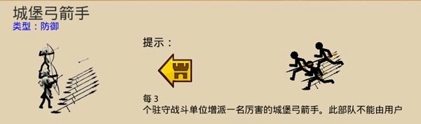 城堡弓箭手:开启防御模式后会自动在城墙部署,是固定防御单位,不能手动操作,不过在守城时可提供稳定的火力支援。