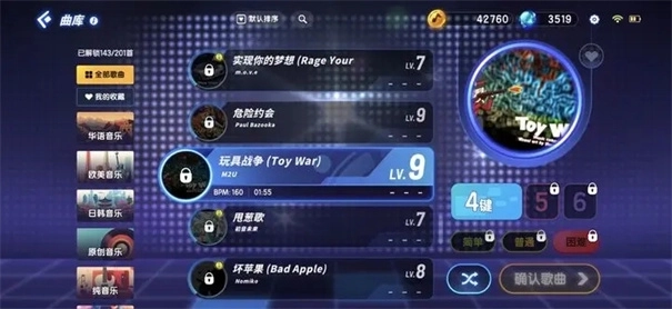 6、歌曲熟练度系统:每完成一场节奏大师,系统会根据玩家的表现给予歌曲熟练度奖励,当某首歌曲的熟练度满时,则可无限制畅享此歌曲
