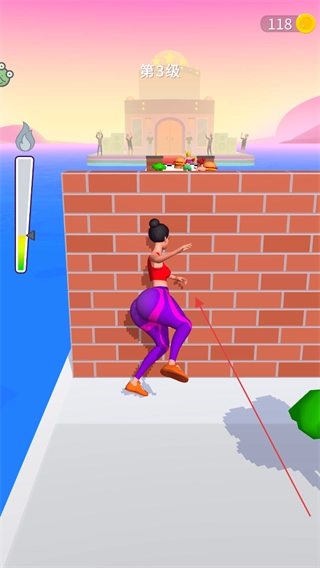 1、第三关里,控制体型变大的角色攀爬砖墙,越过障碍继续向前推进。