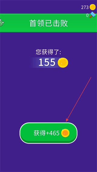 4、成功击败首领后,点击界面上的“获得+465”按钮,即可领取该关卡的通关奖励金币。
