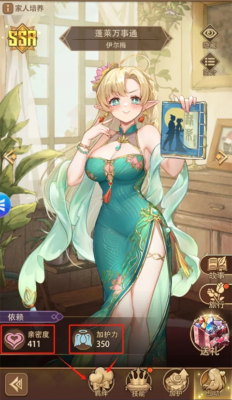 点击送礼按钮,可对家人使用道具以提升亲密度与加护力;当满足特定条件时,即可点击羁绊功能来升级家人的羁绊等级。羁绊等级提升后,不仅能获得特殊加成,还能提高通过约会所获得孩子的等级。