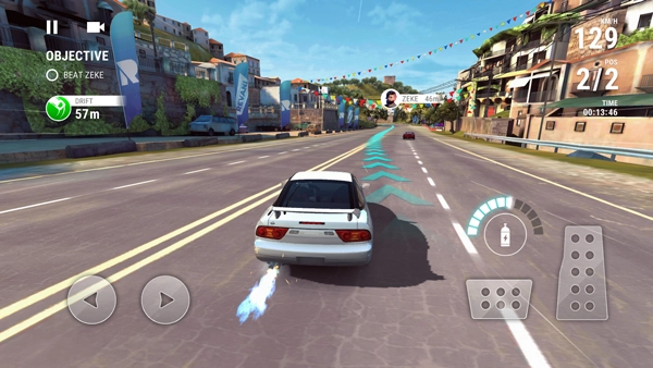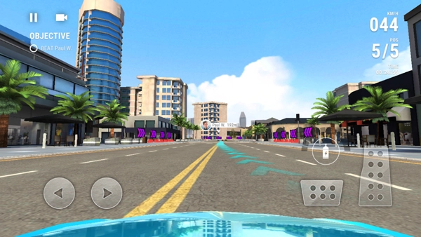 3、接着进入新手教程环节,玩家需要操控赛车完成竞速任务,屏幕左侧的按键用于控制方向,右侧则分布着油门、刹车、氮气加速等功能键位。