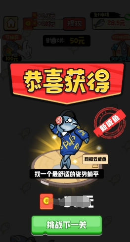2.每通过一个关卡,就能解锁随机的咸鱼图鉴;当点亮全部咸鱼图鉴后,即可完成成就任务,领取丰厚红包奖励。